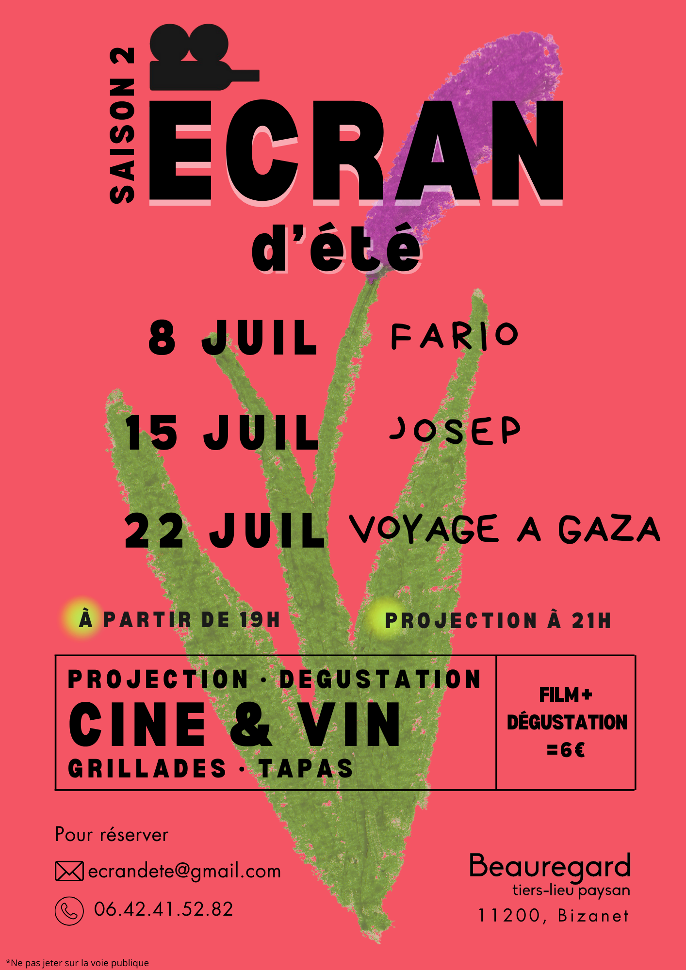 La formule reste la même : 6 euros l’entrée pour la projection et la dégusatation des vins. On vous ouvre la terrasse à partir de 19h avec une proposition de tapas et de grillades. La projection commence à 21h dans la cave.