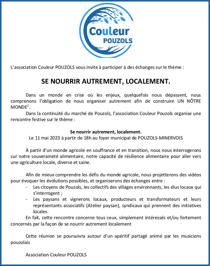Dans un monde en crise où les enjeux, quelquefois nous dépassent, nous comprenons l’obligation de nous organiser autrement afin de construire UN NÔTRE MONDE. Dans la continuité du marché de Pouzols, l’association Couleur Pouzols organise une rencontre festive sur le thème : Se nourrir autrement, localement. À partir d’un monde agricole en souffrance et en transition, nous nous interrogerons sur notre souveraineté alimentaire, notre capacité de résilience alimentaire pour aller vers une agriculture locale, diverse et saine. Afin de mieux comprendre les défis du monde agricole, nous projetterons des vidéos pour évoquer les évolutions possibles, et organiserons des échanges entre :
